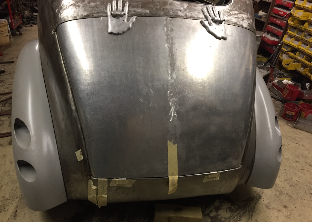 From the back of the car we can see the recessed tail lights. You can also see the scars on the roof of the car from the welding of more panels used to solve the missing material from chopping the top.