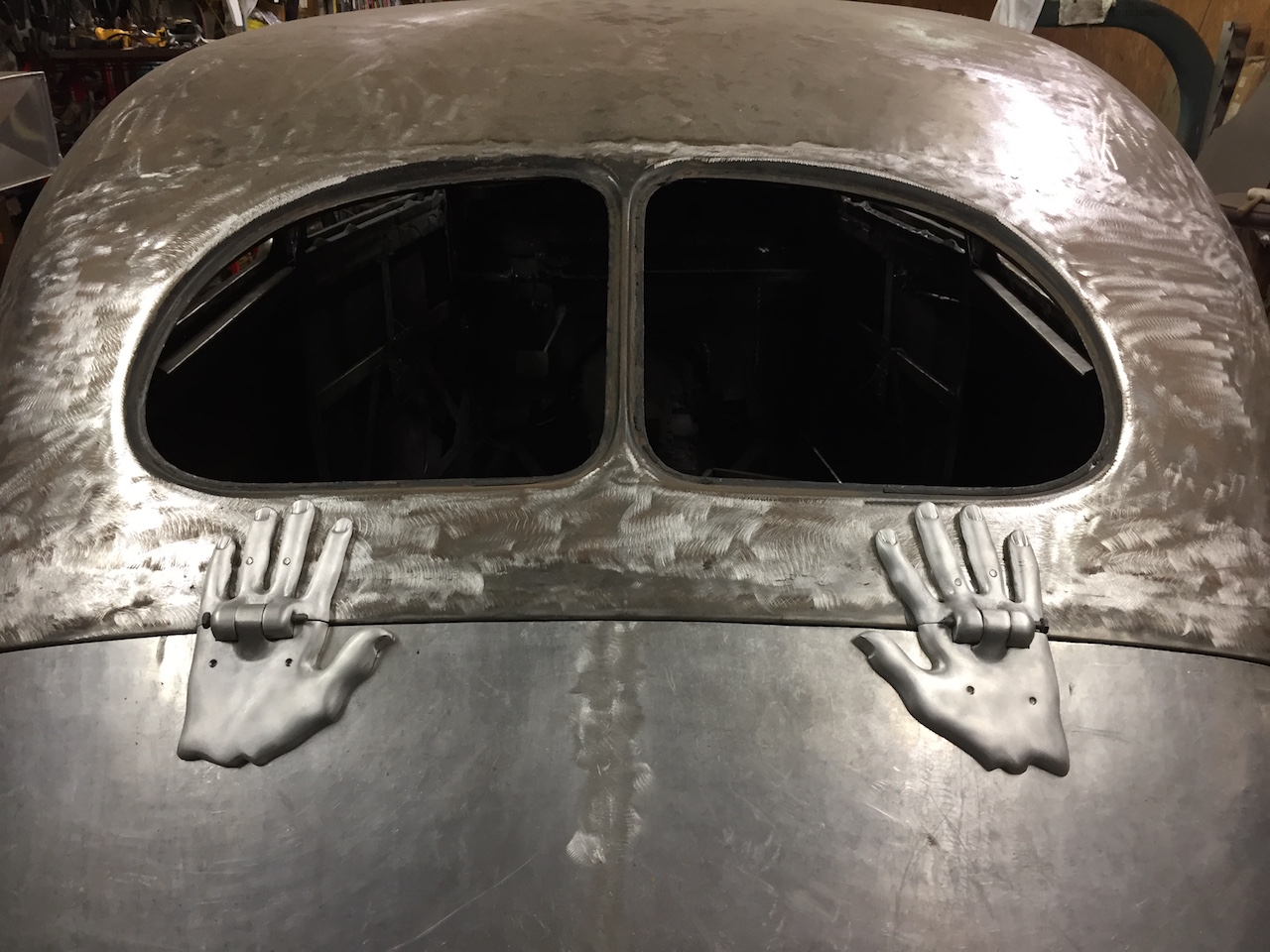 Here is the completed trunk hinges shaped to match a person’s hands. The aluminum hinges are made from a milling machine, files and an air powered engraving tool – that is all! Before you say “Nah!”, ask yourself how you would craft this from a thick chunk of aluminum?