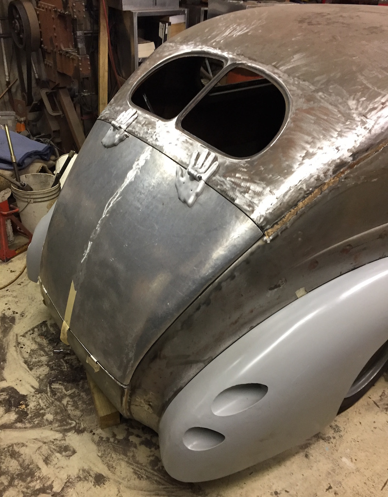 From the back of the car we can see the recessed tail lights. You can also see the scars on the roof of the car from the welding of more panels used to solve the missing material from chopping the top.
