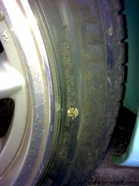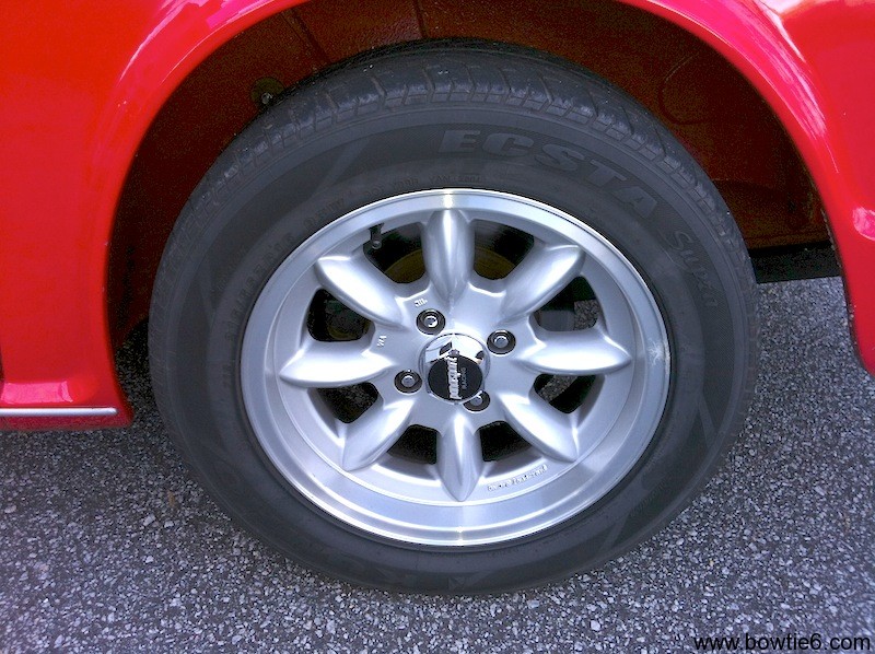 My first set of tires on bowtie6 consisted of four Kuhmo 215/55 tires mounted on those sexy Panasport wheels. The rears fit just fine; however the edge of the front tires rubbed the edge of the front fenders. I really didn’t any body damage so I found a pair of matching 205/55 tires for the front. This solved the rubbing problem.